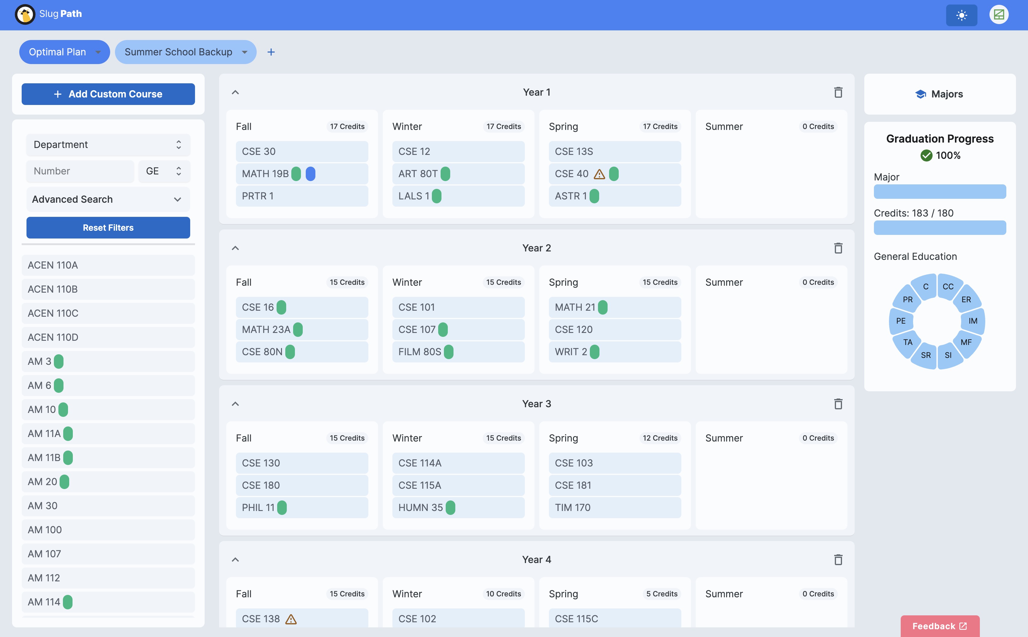 We simplify the degree planning process by bringing course search, catalog planners, GE checking, credit checking, and major verification into one place.