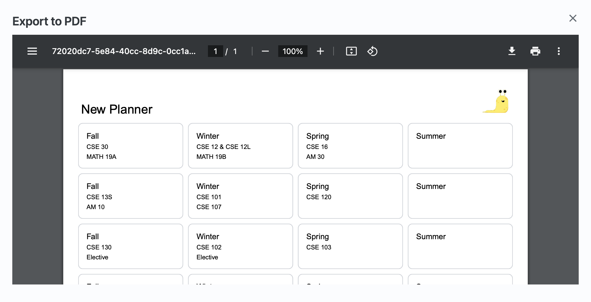 Export your plan to a PDF or share it in website with other users. Seemlessly import plans from other students.